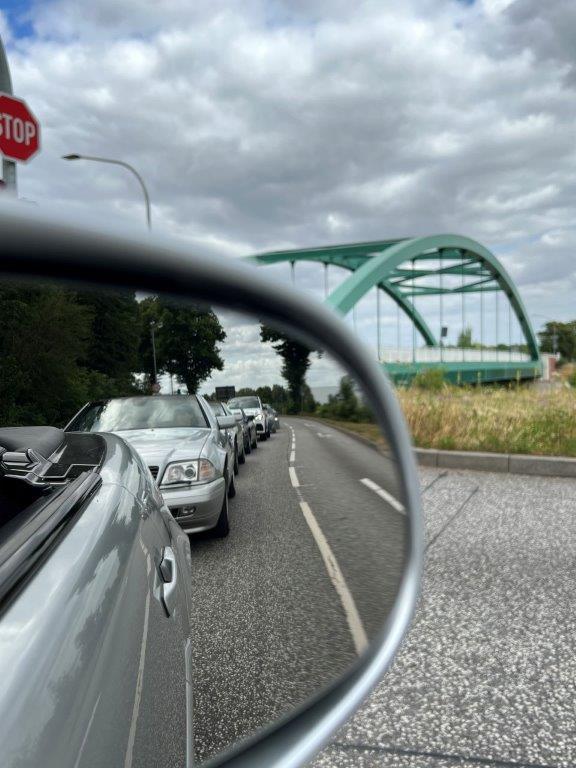 Im Bereich der Hafenrandstrasse wurde ein kleiner Zwischenstopp zum sammeln eingelegt und leider sprang danach die Diva von Tom nicht mehr an, so dass wir ihn zurück lassen mussten. Nach einiger Zeit sprang sein Auto wohl wieder an und er ist dann mit stotterndem Motor nach Hause gefahren. Ich hoffe, es war kein größeres Problem und wir können Tom bald wieder in unseren Reihen begrüßen.