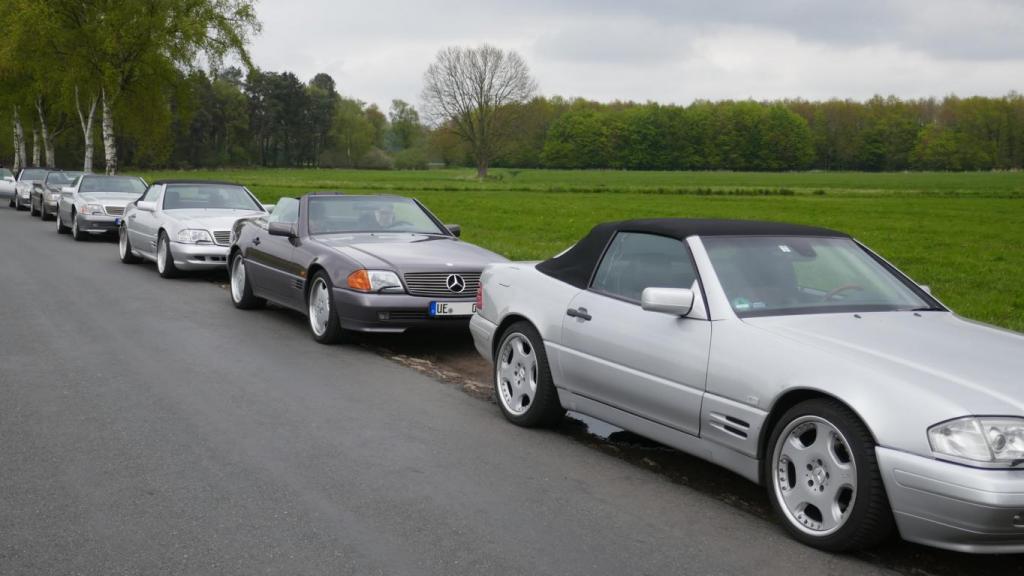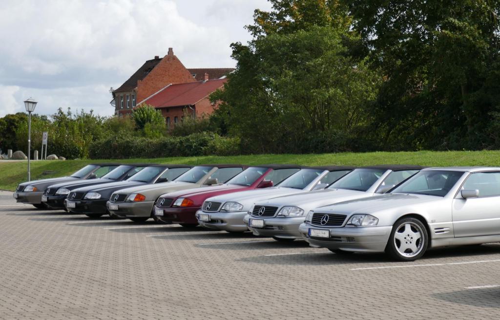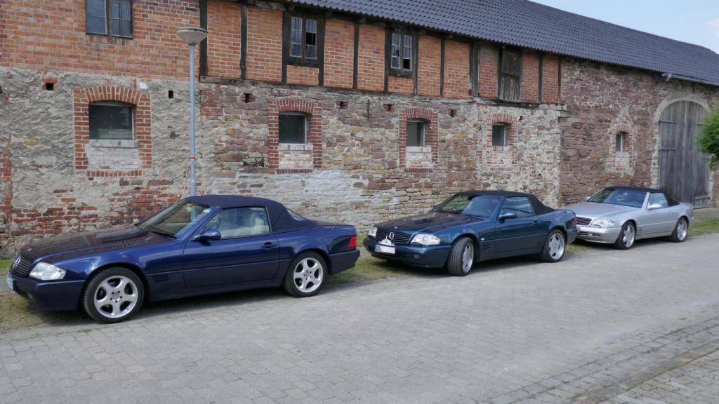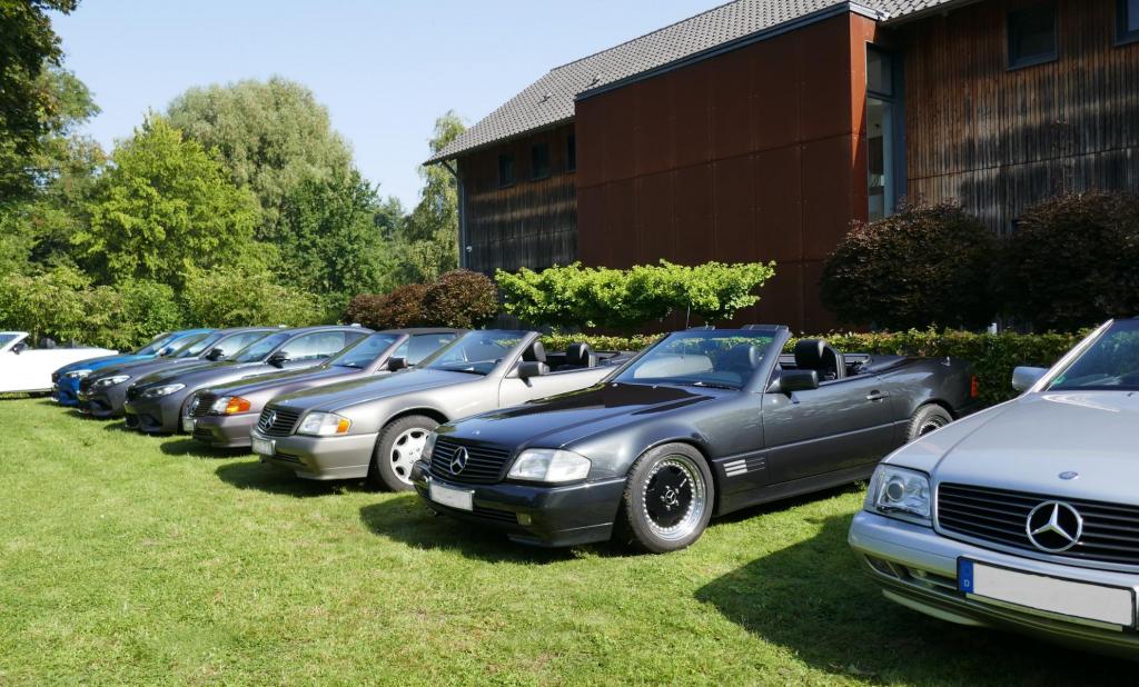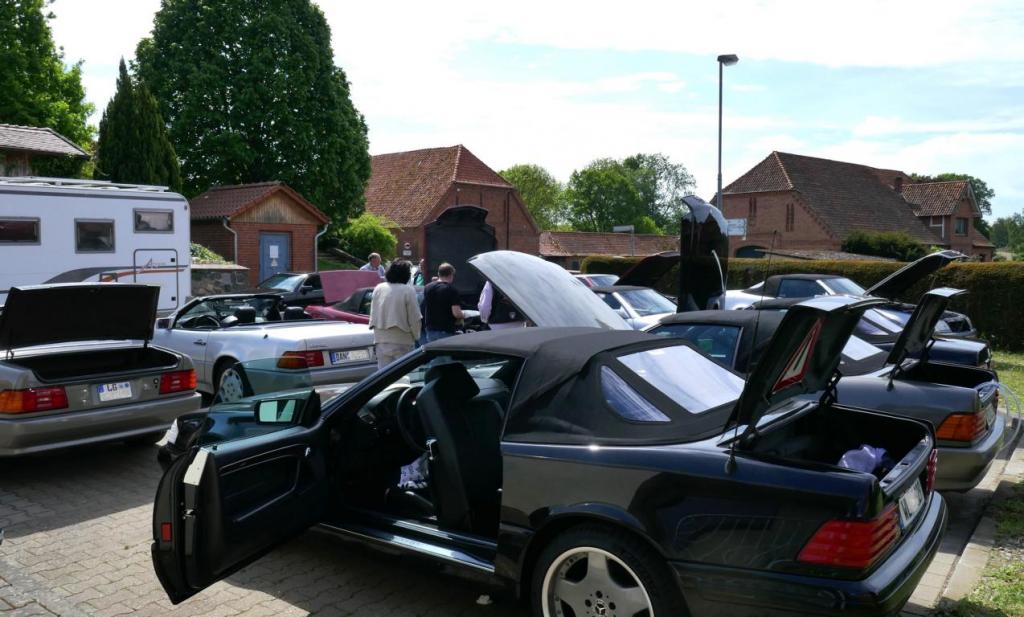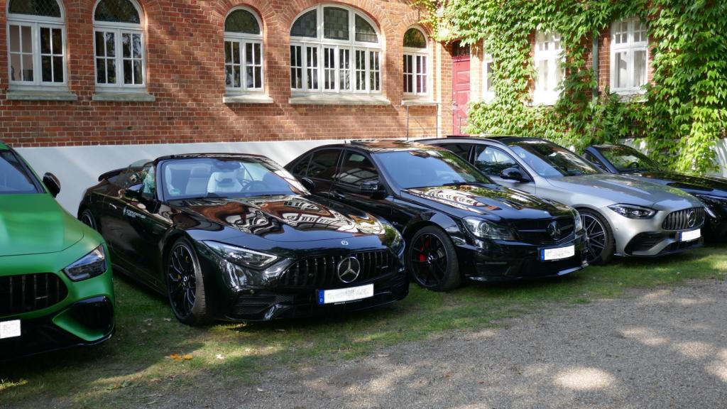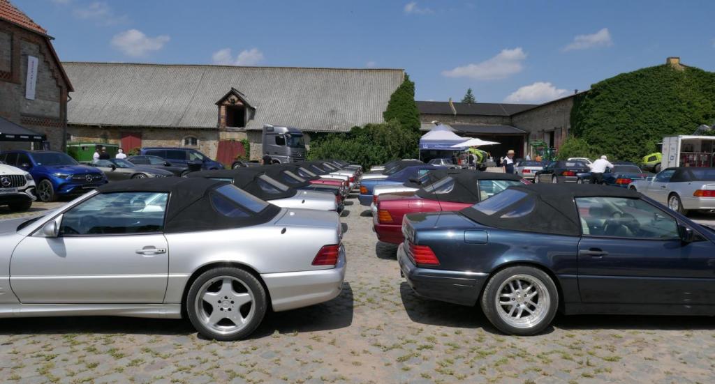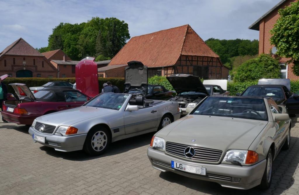 Es ging es nach einem spontanen WhatsApp Aufruf am 09.09. zu einem ehemaligen Trabergestüt südlich von Lüneburg. Zunächst trafen wir uns um 11:00 Uhr an einem Bushaltepunkt, der an diesem Tag nicht bedient wurde. Mit fünf Fahrzeugen ging es anschließend wenige Kilometer weiter, bis wir auf dem herrlich gelegenen Gutsgelände ankamen, um dann gut platziert, die ankommenden Fahrzeuge zu bestaunen. Uns viel auf das viele AMG Modelle von Mercedes, wie einige C 43, GT 43, C + E 63, SL und SLS 63, G 63 AMG sowie BMW M2, M3, M5 und auch diverse Porsche Fahrzeuge an diesem Tag aus den Garagen und einigen Händlerparkplätzen geholt worden sind, um dort mit dem überwiegend recht "jungen" Publikum und Fahrern zu "glänzen". Wer nun jedoch gedacht hätte das unsere doch schon etwas "älteren" Roadster nicht beachtet worden, der lag jedoch falsch. In kleineren Menschengruppen wurde öfters versucht die einzelne Modellpflege zu unterscheiden. Die 1989 mit der Präsentation begann und mit Modellpflegen 1989 bis 1995, 1995 bis 1998, 1998 bis 2000 und einer weiteren leichten Modellpflege im Jahr 2000 zum Erfolg des R129 führte, bis dann im Jahr 2001 das lezte Fahrzeug dieses SL von der Baureihe R230 im Oktober 2001 abgelöst wurde. Mit netten Gesprächen rund um schöne Fahrzeuge in dieser herrlichen Umgebung, endet für uns das Treffen gegen 15:00 Uhr vor Ort. Im Anschluß gab es im Kreise unserer R129 Freunde eine kleine Ausfahrt bis zu unseren Clubfreunden Peter und Ulrike, die uns zu einem Kaffee und sehr leckerem Kuchen zu sich nach Hause eingeladen hatten, bevor wir uns dann voneinander verabschiedet hatten..Leider reichte vorher das Veranstaltungsgelände für die vielen Fahrzeuge dann doch nicht aus, so kamen einige "Nachzügler" nicht mehr in den Genuss, diesen schönen Sonntag bei bestem Wetter auf dem Gutsgelände zu geniessen...Wir freuen uns daher schon auf ähnliche Veranstaltungen im kommenden Jahr!