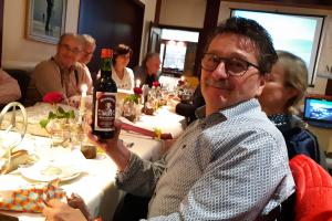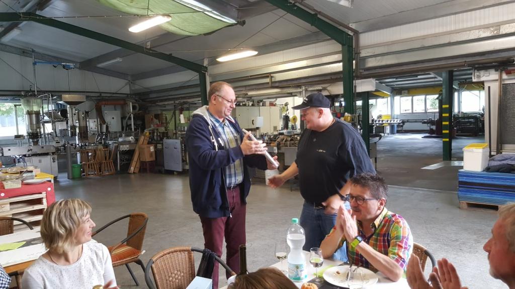 Vorstandsmitglied Frank Risse mit einem Weinpräsent beschenkt.