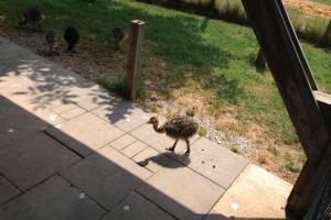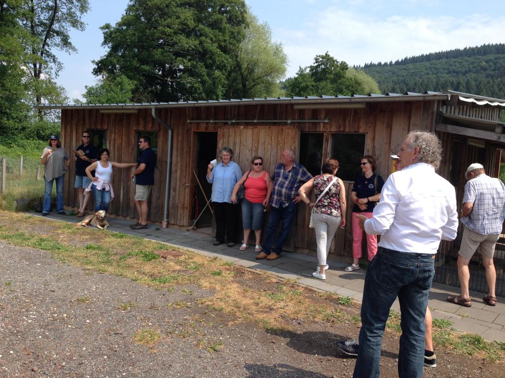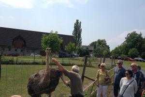 Nun setzten wir unsere Fahrt fort, vorbei an weltbekannten Weinlagen wie Ürziger Würzgarten, Erdener Treppchen und Kröver Nacktarsch. Nach einer halben Stunde erreichten wir dann unseren nächsten Programmpunkt, die Besichtigung der Straußenfarm in Bengel. Herr Engels führte uns fachkundig und humorvoll in die Welt der Strauße ein. Die große Hitze am frühen Nachmittag ließ uns immer wieder an schattige Stellen flüchten. Den 11 Tage alten Ministraußen schien die Hitze nichts auszumachen.