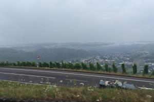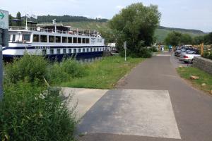 Nach dieser willkommenen Abkühlung überquerten wir ein letztes Mal die Mosel, und bewältigten einen steilen Aufstieg Richtung Hunsrück. Wir fuhren durch einige idyllische Hunsrückdörfer und erreichten nach einer guten Stunde Fahrzeit den Endpunkt unserer Tour, das Restaurant-und Hotelschiff "River Bär" in Mülheim.