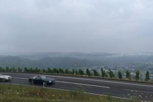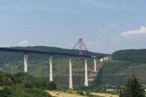 Nach einem ausgiebigen Frühstück über den Weinbergen, begann nun der Abstieg zurück ins Moseltal, um ein Stück weiter moselabwärts erneut einen Aussichtspunkt zu erklimmen, nämlich die Baustelle des imposanten Hochmoselübergangs. Dort positionierten wir unsere Fahrzeuge um ein paar schöne Bilder zu schiessen, natürlich standesgemäß mit den RT Fahnen.