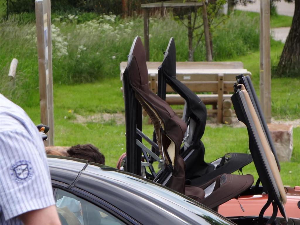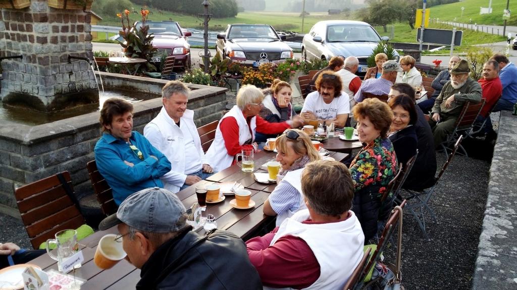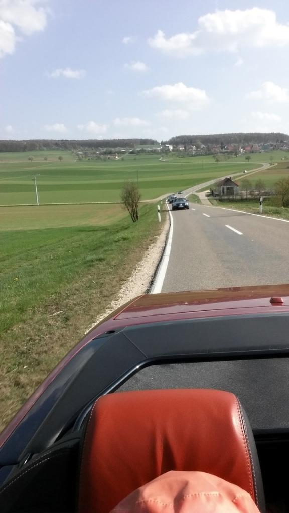 Nachdem es Nebel hatte kamen alle noch mit geschlossenem Verdeck bis auf Eugen und Hella. Als sie bei sich Zuhause abfuhren strahlte schon die Sonne. Christiane meldet noch 2 Fahrzeuge aus Friedrichshafen nach, die uns entgegenfahren und uns auf halber Strecke treffen wollten.