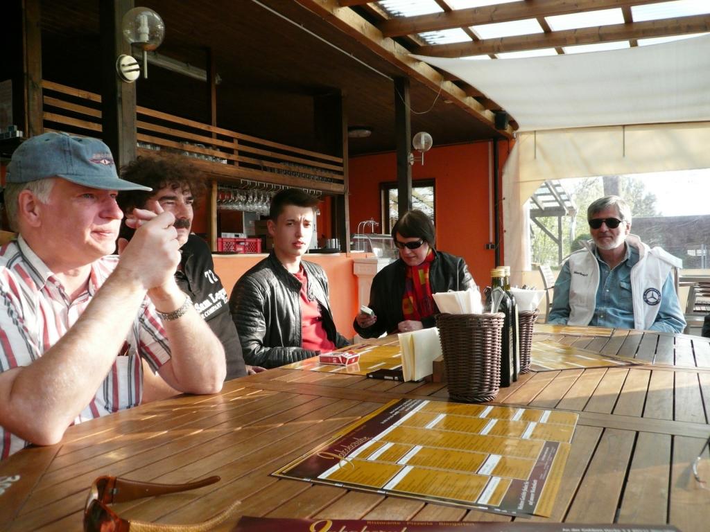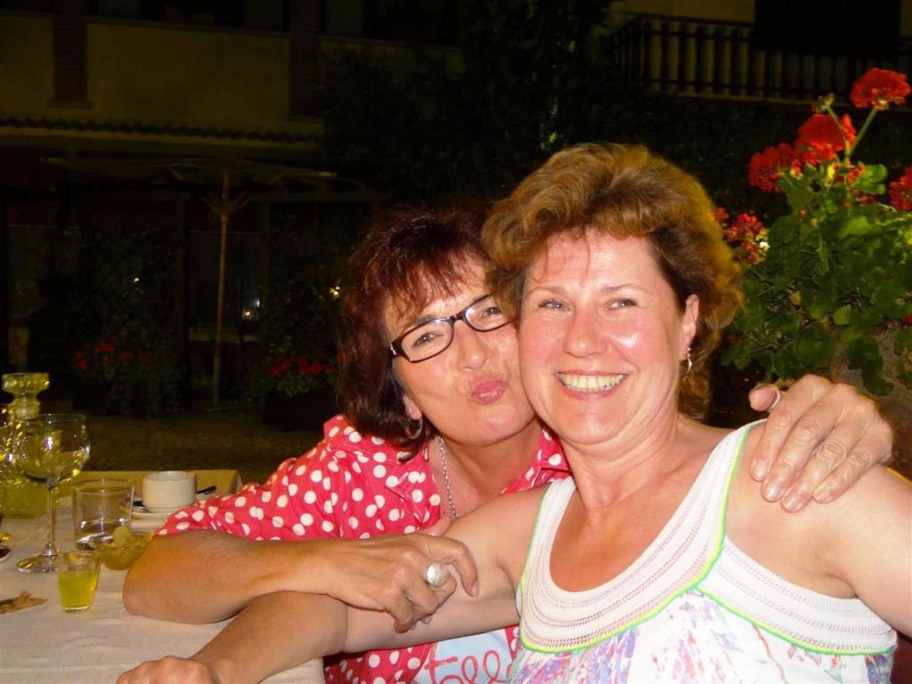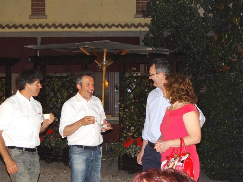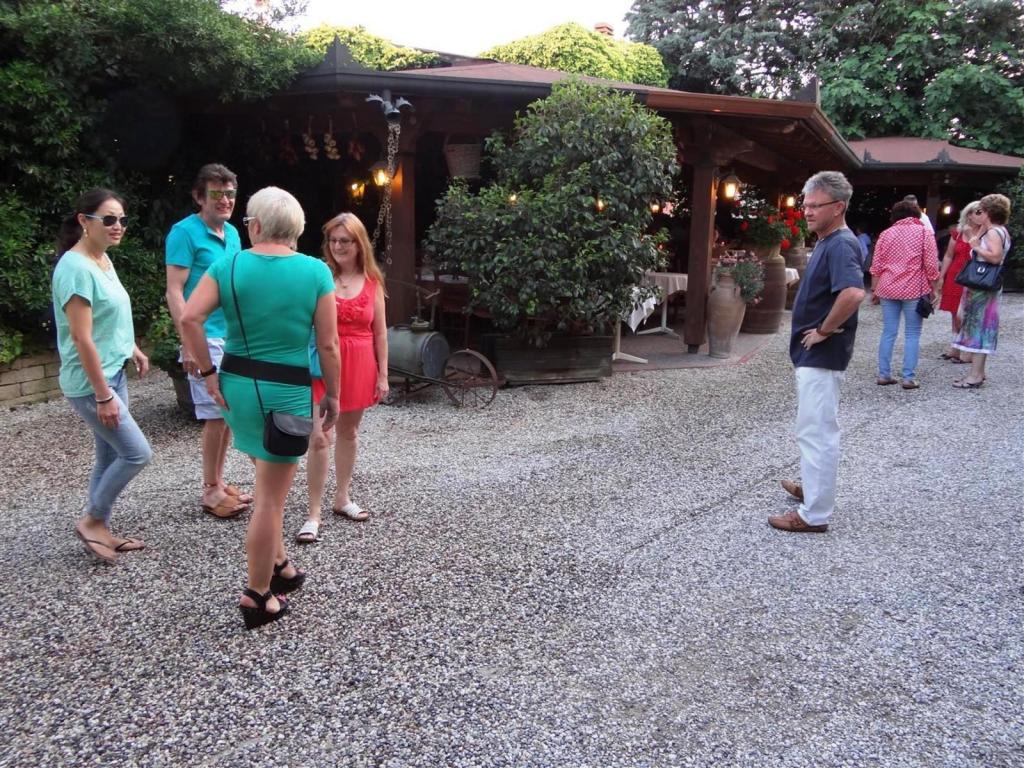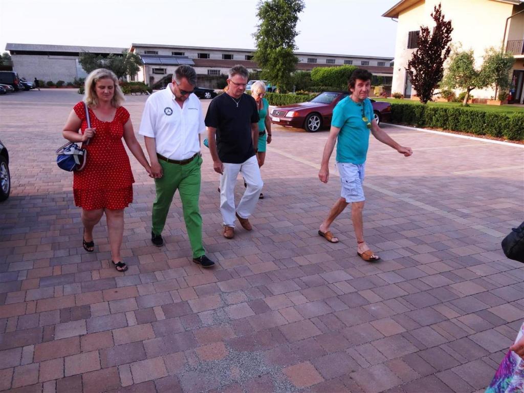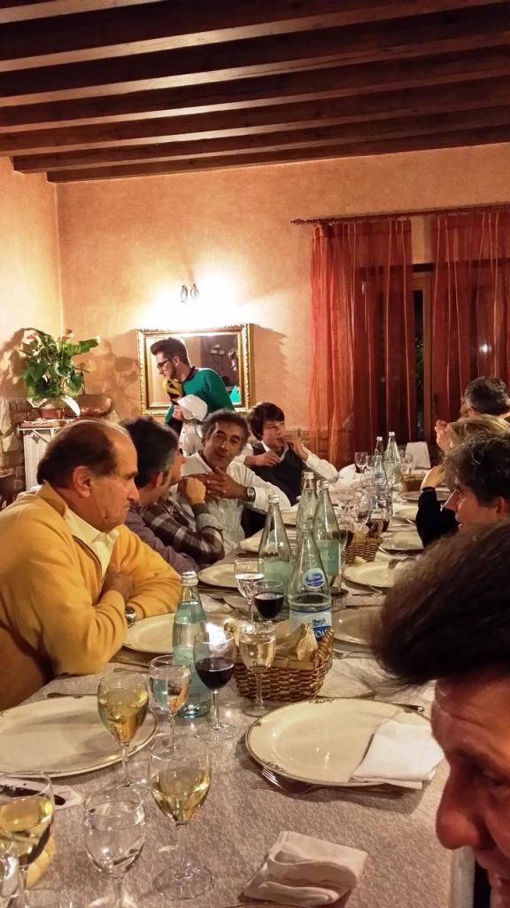 Nach einer kurzen Begrüßung, dem Zimmer beziehen und etwas frisch machen, trafen wir uns dann wieder im ca. 500 Meter entfernten Restaurant Trattoria Fornello, in dem eigentlich seit 19:00 Uhr Tische für uns reserviert waren. Bei einem ausgezeichneten italienischen Menü und vielen netten Gesprächen in italienisch, englisch, deutsch und mit Händen und Füßen, rund um die R129 und der geplanten Ausfahrt am Sonntag, verbrachten wir, bei immer noch knapp +30°C, einen tollen Ausklang des Tages. Als wir uns von Alberto, Lorenzo, Franco und ihren Mitfahrern verabschiedeten, versprachen wir, uns entweder in Ulm oder zur Oldtimermesse in Padua erneut zu treffen.