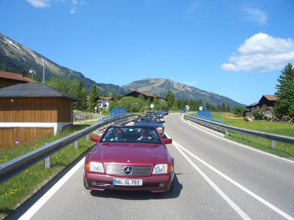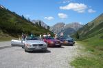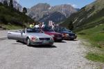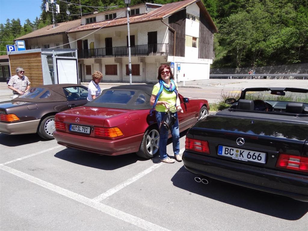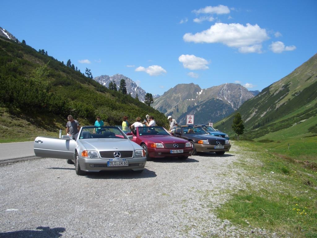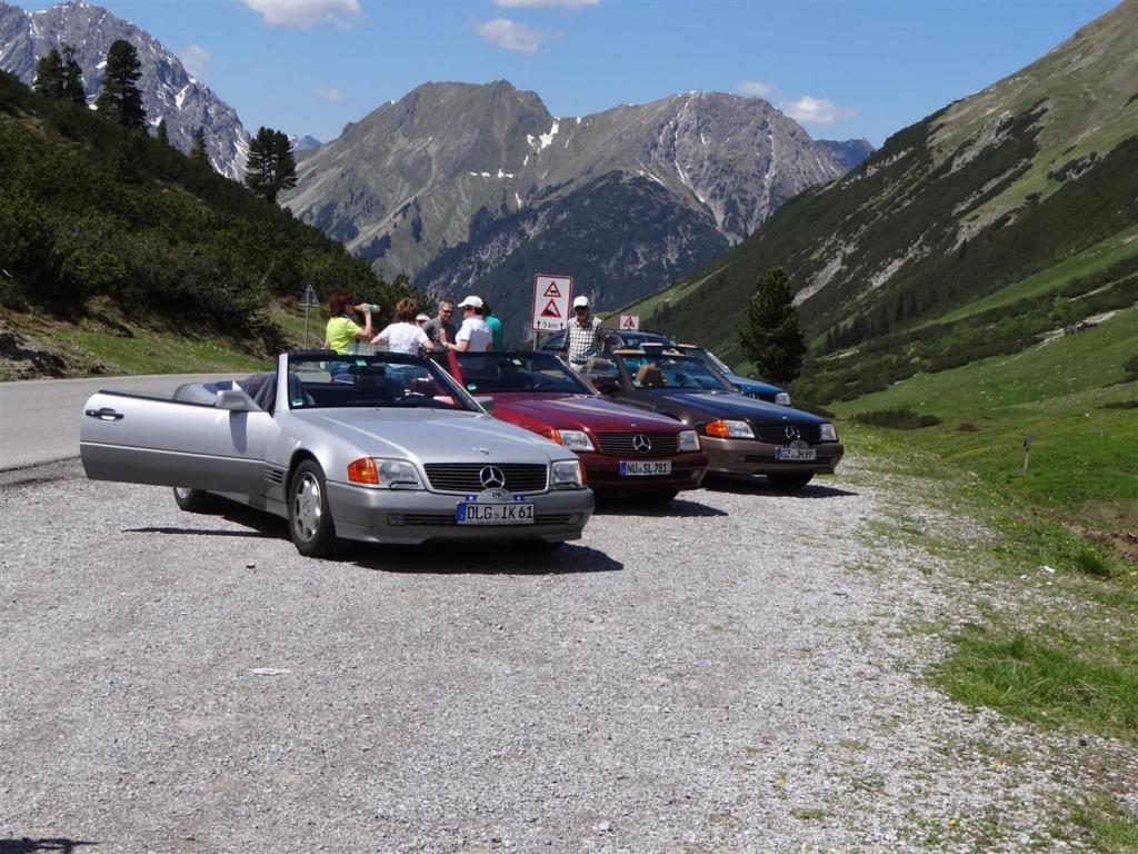 Los ging’s dann am Samstag 07. Juni 2014. Wir (Christiane mit Alex, Thomas mit Corinna, Simone mit Marion, Herbert mit Ingrid) trafen uns um 08:45 Uhr mit vier R129 in Nersingen auf dem Parkplatz der Brauereigaststätte Seybold. Nach der traditionellen Abfahrts-Zeremonie machten wir uns mit offenem Verdeck (die Temperatur war bereits auf über 20°C angestiegen) auf den Weg über die A7 um unterwegs noch zwei weitere R129 mitzunehmen (Michael mit Larissa, Inge mit Herbert Nachdem wir im Verkehrsfunk gehört hatten, dass im Grenztunnel Füssen sowie am Brenner und zwischen Brenner und Rovereto schon seit den frühen Morgenstunden Stau herrschte, beschlossen wir unsere Route zu ändern und über das Tannheimer Tal und das Hahntenn-Joch diese Staus sowie den Fernpass zu umgehen. Angeführt wurden wir, für diese Etappe, von Herbert dem „Allgäuer“. Die Temperatur war inzwischen angestiegen auf +30°C. Für einige von uns war das Hahntenn-Joch „Neuland“ und wir alle genossen die Fahrt durch die vielen Kehren.