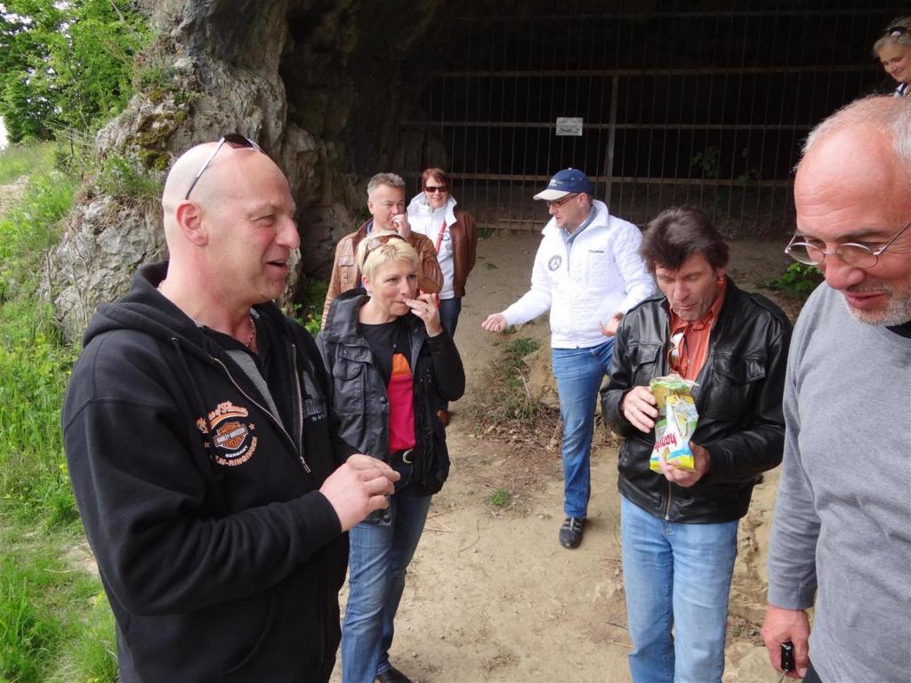 Nun wird es richtig spaßig. Raus aus dem Ort, rein in das gediegene Kurvenfeeling und nun geht es wieder Richtung Osten. Der Guide weiß auch nicht was er will. Über Fünfstetten, Itzing, Schweinspoint (lustiger Ortsname, aber extrem tolle Aussicht in den Donau/Ries Krater) nach Rennertshofen. Zweiter Stopp erst bei den Höhlen von Mauern. Der Guide nervt schon wieder. 15 Minuten und es soll weiter gehen. Millionen Jahre alte Höhlen und jetzt Zeitdruck. Nee, so geht es nicht. Wir schauen uns in Ruhe die Höhlen an. Hella sorgt mit kleinen Süßigkeiten dafür, dass beim Anstieg keiner unterzuckert. Die Höhlen sind interessant. Hier sollen früher wirklich Säbelzahn und Meister Petz in der Jumboausführung gelebt haben.
