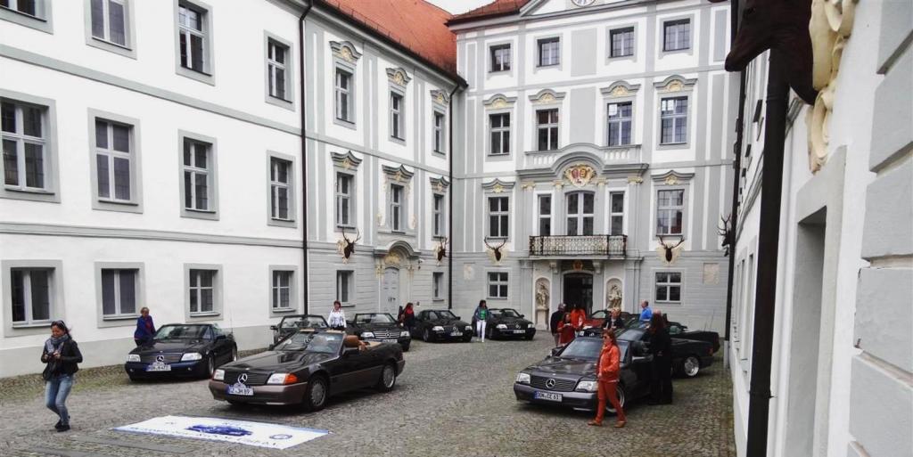 Jetzt heißt es retour. Der feudale Track mit mind. 2500 PS setzt sich gegen Westen in Bewegung. Schön, selbst bei regennassen Straßen liegt der R129 wie ein Brett und macht noch richtig Spaß beim Fahren. Auf halber Strecke zurück nach Rain am Lech erkennt Petrus wer da unterwegs ist und gibt sofort „Sonnenbefehl“. Die Dächer werden unverzüglich geöffnet und es geht ab ins Dehner Blumenhotel bzw. ins Restaurant. Gehobene Küche……