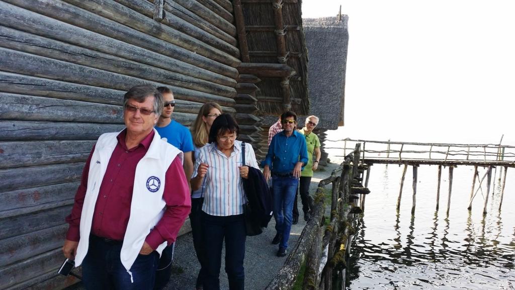 Bernd, Colette und Karin erwarteten uns schon. Nach Parken im Parkhaus Post und einem guten Mittagessen im Ristorante Arena in Überlingen ging’s anschließend das kurze Stück weiter mit 12 Fahrzeugen zum Parkplatz des Pfahlbautenmuseum. Dort hatten wir eine Führung gebucht.
